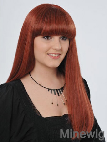 22 inch Red Long Straight With Bangs Monofilament Real Hair Wigs